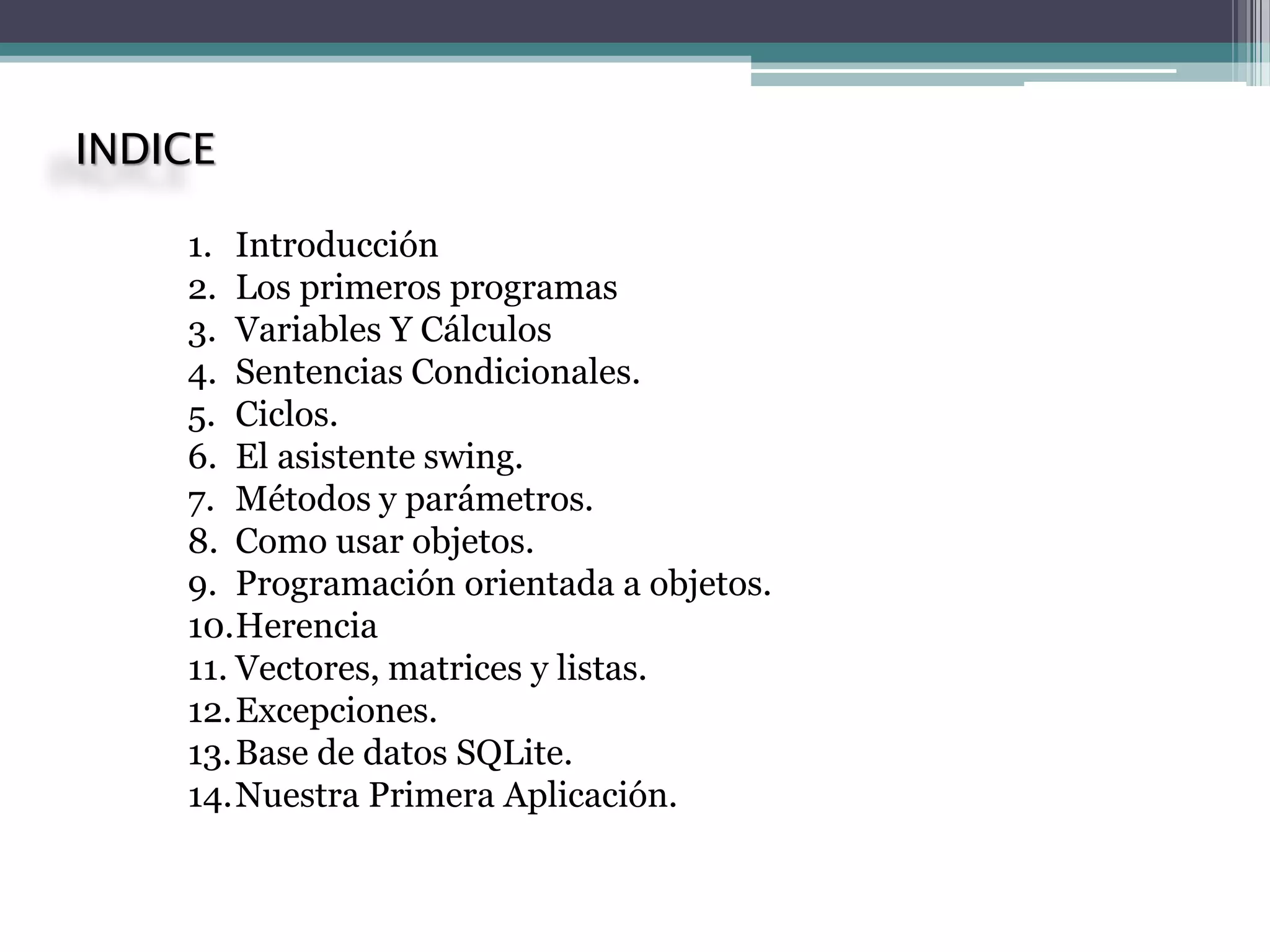 Este documento presenta una introducción a la programación en Java. Cubre temas como variables, operadores, sentencias condicionales, ciclos, métodos, objetos, herencia, vectores, matrices, listas, excepciones y bases de datos SQLite. El documento también incluye ejemplos de "Hola Mundo" y actividades para practicar los conceptos aprendidos.