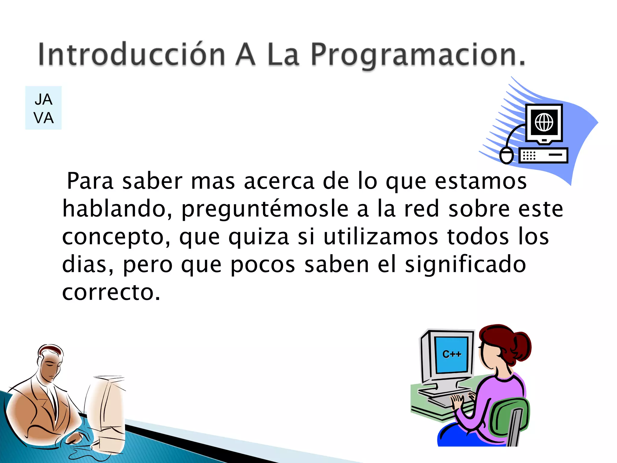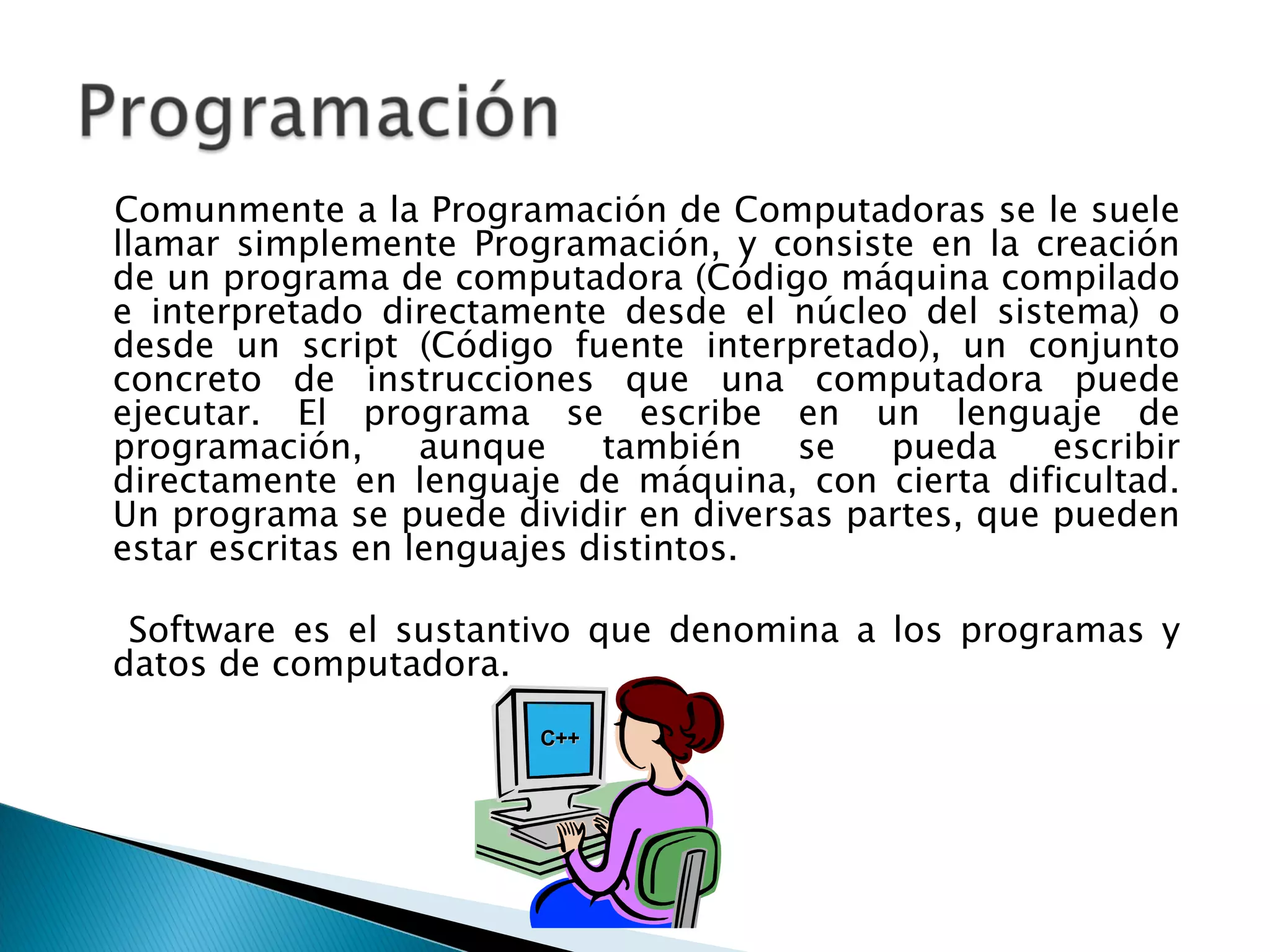 El documento explica los conceptos básicos de la programación de computadoras, incluyendo las definiciones de software, hardware, lenguajes de programación, tipos de software como sistema operativo, aplicaciones, multimedia, y los roles del programador y el programador. También describe conceptos como datos, variables, operadores y expresiones.