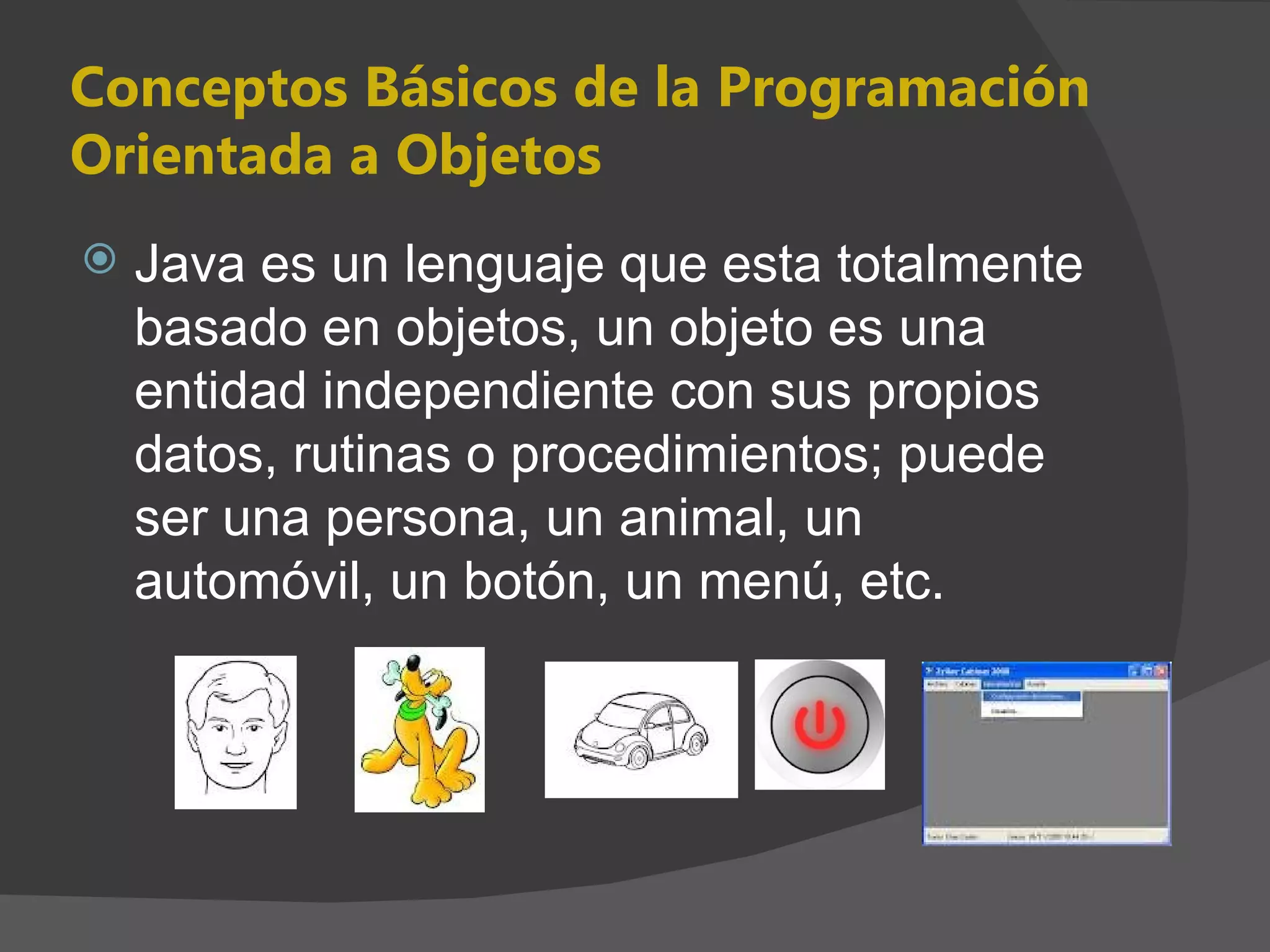 Este documento proporciona una introducción a los conceptos básicos de la programación orientada a objetos en Java, incluyendo definiciones de objetos, clases, atributos, métodos, constructores, instancias, variables, tipos de datos, operadores y más.