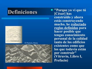El documento presenta diferentes definiciones de arquitectura a través de la historia desde Vitruvio hasta autores contemporáneos. Define la arquitectura desde perspectivas etimológicas, culturales, funcionalistas, lingüísticas y espaciales. También explora la relación entre teoría, historia y diseño arquitectónico.