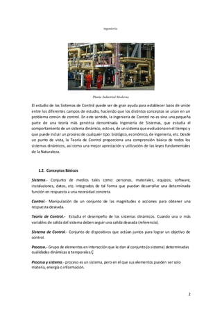 La teoría de control es una disciplina que aborda problemas complejos mediante la optimización y el feedback en diversos sistemas, desde aplicaciones simples como la regulación de cisternas hasta complejos procesos industriales. Se clasifican los sistemas de control en lazo abierto y lazo cerrado, cada uno con sus ventajas y desventajas, y se destaca la importancia de la transformada de Laplace en el análisis de sistemas dinámicos a través de ecuaciones diferenciales. A lo largo de la historia, el desarrollo de la automatización y el control ha evolucionado significativamente, marcando hitos importantes en la ingeniería moderna.