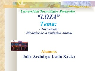 El documento proporciona una introducción a la toxicología, incluyendo definiciones de términos clave como tóxico, toxina y dosis. Explica las diferentes subdisciplinas de la toxicología como la toxicología ambiental y ocupacional. También enumera agencias gubernamentales clave que regulan sustancias químicas y proporcionan información toxicológica, como la EPA, CDC y FDA. Finalmente, cubre conceptos básicos de dinámica de poblaciones, incluidos la natalidad y la mortalidad.