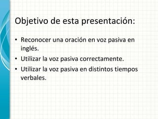 Este documento presenta una introducción a la voz pasiva en inglés. Explica la estructura gramatical de la voz pasiva y cómo transformar oraciones de voz activa a pasiva. También describe los usos comunes de la voz pasiva, como enfatizar el objeto de la oración o cuando el sujeto no es claro. Finalmente, muestra ejemplos de oraciones pasivas en diferentes tiempos verbales.