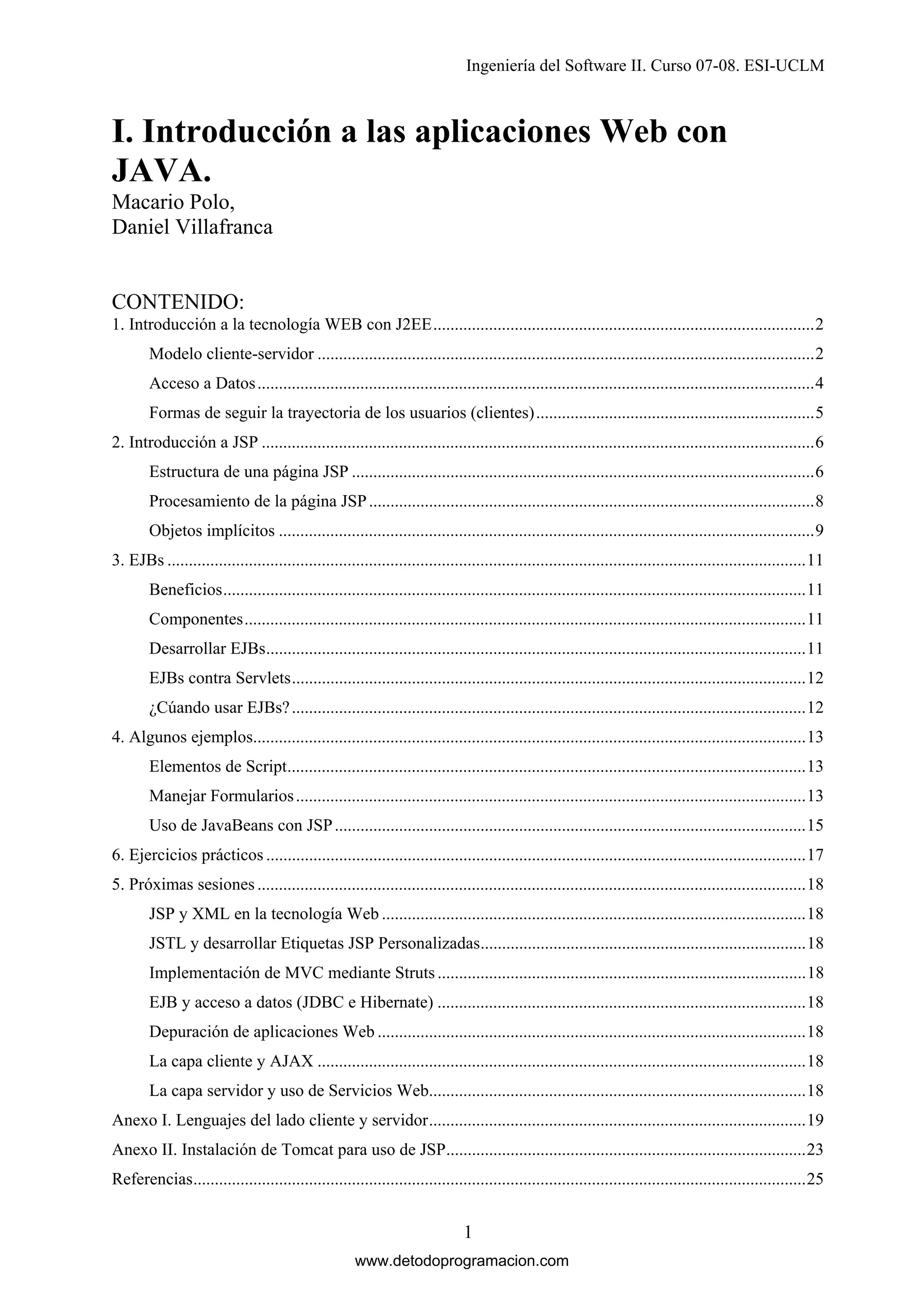 Este documento presenta un curso sobre ingeniería de software II con énfasis en aplicaciones web con Java. Introduce conceptos clave como el modelo cliente-servidor, el acceso a datos, y formas de seguir la trayectoria de usuarios. Explica las tecnologías JSP, EJB y Servlets para el desarrollo web con Java y provee ejemplos de su uso. Finalmente, anticipa temas a cubrirse en sesiones posteriores como JSP y XML, frameworks como Struts, y el uso de servicios web.