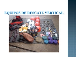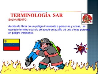 El documento describe diferentes tipos de rescate y salvamento, incluyendo definiciones de términos como salvamento, rescate y búsqueda. También describe procedimientos para rescate en tierra, agua y aire, así como consideraciones de seguridad para rescates en espacios confinados y entre escombros.