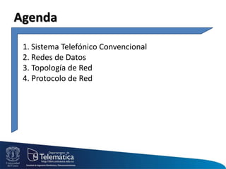 El documento describe la evolución de los sistemas de telefonía, desde los primeros sistemas manuales hasta los sistemas automáticos modernos, así como el surgimiento de las redes de datos y los conceptos básicos sobre topologías, protocolos y clasificaciones de redes.