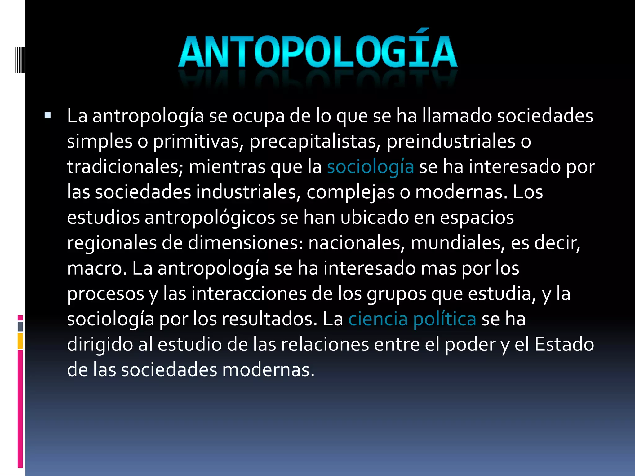 Este documento presenta un resumen de las principales ciencias sociales. La antropología estudia las sociedades tradicionales y se enfoca en los procesos grupales, mientras que la sociología analiza los resultados en sociedades modernas. La ciencia política examina las relaciones de poder y el estado. Otras disciplinas incluyen la economía, la psicología, la historia y la geografía humana. El documento también define conceptos clave como cultura, sociedad, grupo, procesos sociales y cambio social.