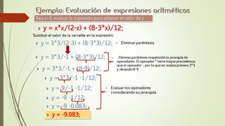 Este documento introduce conceptos básicos de algoritmos como variables, constantes, tipos de datos, identificadores y operadores. Explica que las variables son estructuras de datos que pueden cambiar su contenido durante la ejecución de un programa y que existen variables de tipo entero, real, carácter y lógico. También define constantes, identificadores y los diferentes tipos de operadores como aritméticos, relacionales y lógicos. Por último, introduce diagramas de flujo como una representación gráfica de un proceso algorítmico.