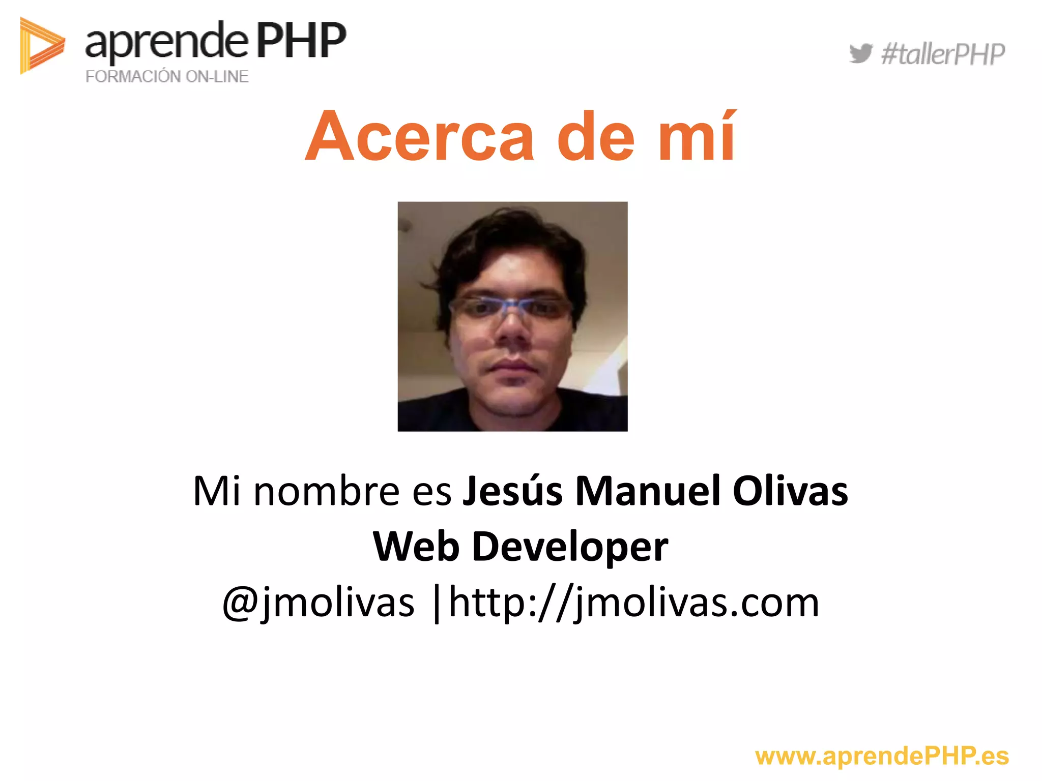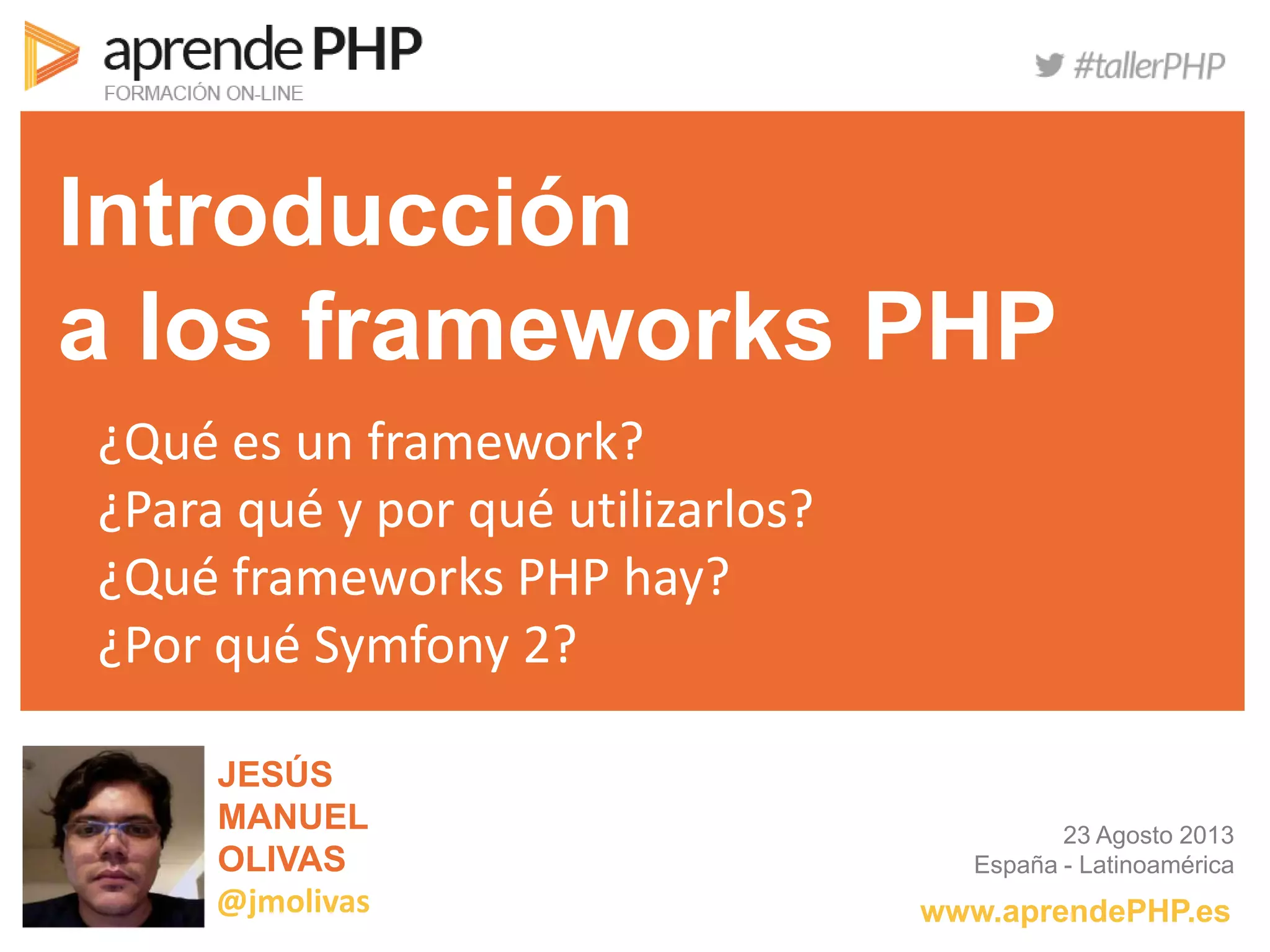 El documento describe qué son los frameworks PHP, su utilidad en el desarrollo de software y se enfoca en Symfony 2, destacando sus beneficios como seguridad, persistencia de datos y cumplimiento de buenas prácticas. También enfatiza la importancia de evitar el síndrome 'not invented here' al utilizar herramientas existentes en lugar de reinventar la rueda. Finalmente, se ofrece un curso de Symfony 2 dirigido a desarrolladores en España y Latinoamérica, con un enfoque en la enseñanza práctica y accesible.