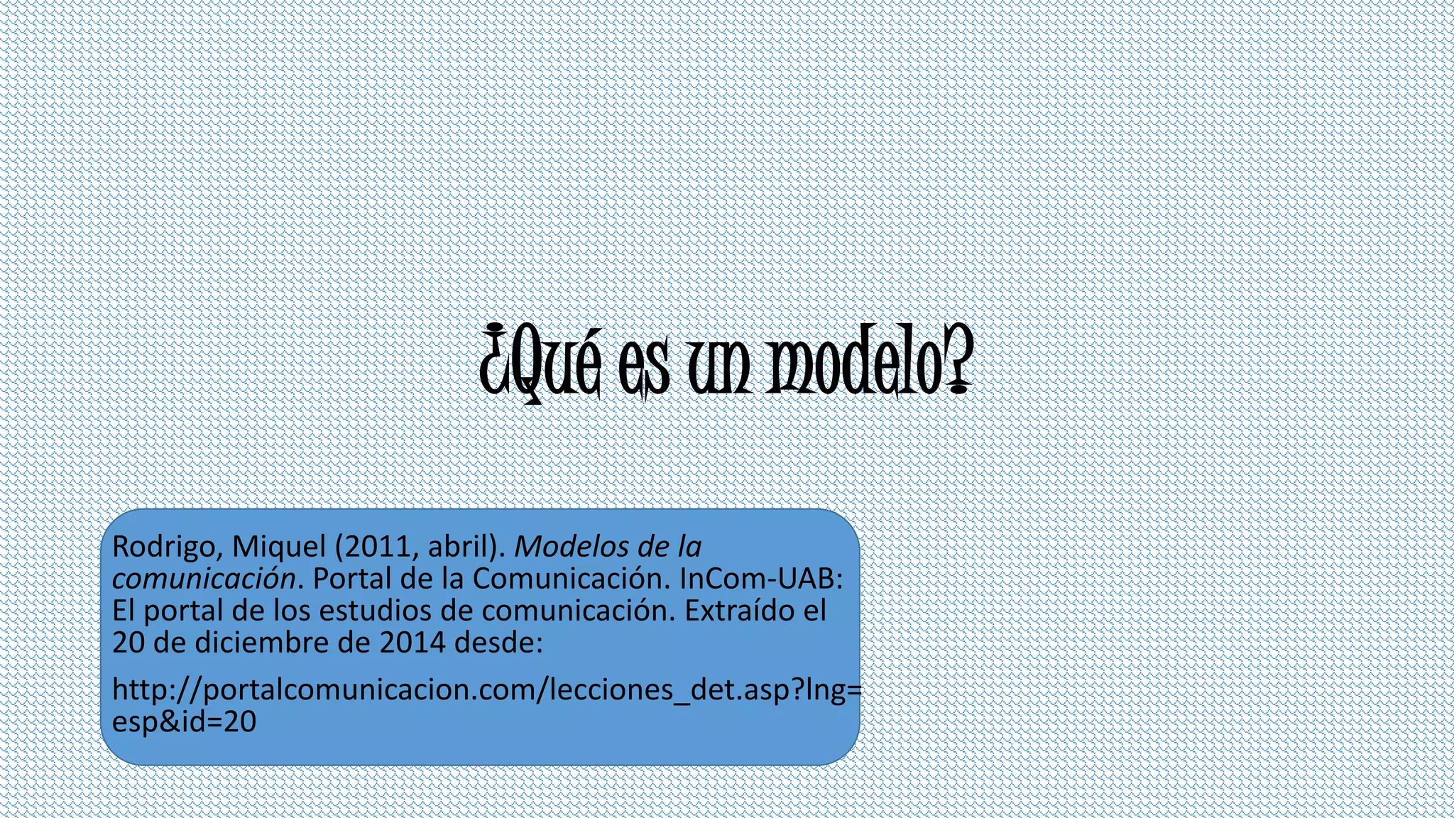 El documento define qué es un modelo y explica los modelos de comunicación de Shannon y Weaver y de Berlo. Un modelo es una herramienta teórica para interpretar la realidad y describir procesos comunicativos de manera simplificada. El modelo de Shannon y Weaver describe el proceso de comunicación como una transmisión de mensajes a través de un emisor, canal y receptor, mientras que el modelo de Berlo enfatiza los procesos de codificación y decodificación entre el emisor y receptor.