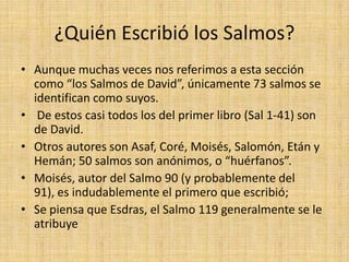 El documento resume brevemente la autoría de los Salmos, notando que aunque muchos se atribuyen a David, otros fueron escritos por autores como Asaf, Coré, Moisés y Salomón. Explica que al menos 14 Salmos son considerados "mesiánicos" porque son citados en el Nuevo Testamento y se aplican a Jesús. Finalmente, lista algunos de los Salmos considerados mesiánicos.