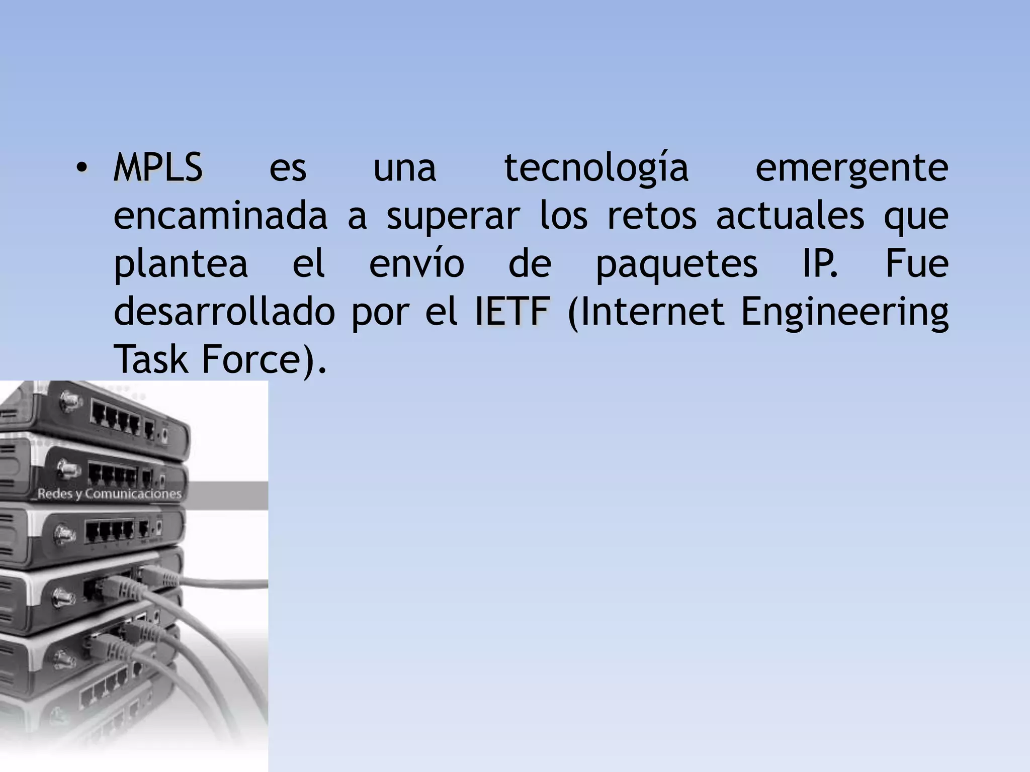 MPLS es una tecnología emergente desarrollada por el IETF para superar los retos de las redes IP actuales. Funciona entre la capa de enlace y red del modelo OSI para combinar las características de ambas capas. MPLS permite crear redes flexibles y escalables que admiten conexiones entre cualquier punto de la red.