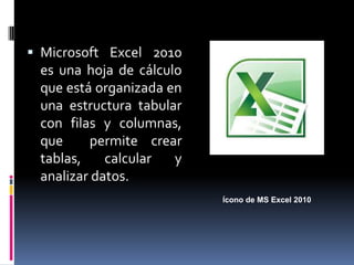 Microsoft Excel 2010 es una hoja de cálculo organizada en una estructura tabular con filas y columnas que permite crear tablas, calcular y analizar datos. Excel 2010 facilita el análisis, administración y compartición de información para tomar mejores decisiones, y sus herramientas de visualización y análisis de datos ayudan a identificar tendencias importantes.