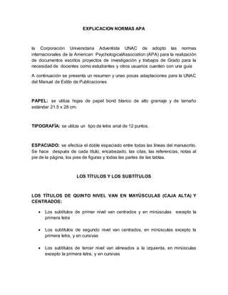 Este documento presenta las normas APA para la presentación de documentos escritos. Explica las normas para el formato, citas, referencias, tablas, figuras y estilo de escritura. Entre otras cosas, indica que se debe usar tipo de letra Arial 12, doble espaciado, números romanos para páginas preliminares, y listas de referencias alfabéticas al final del documento.
