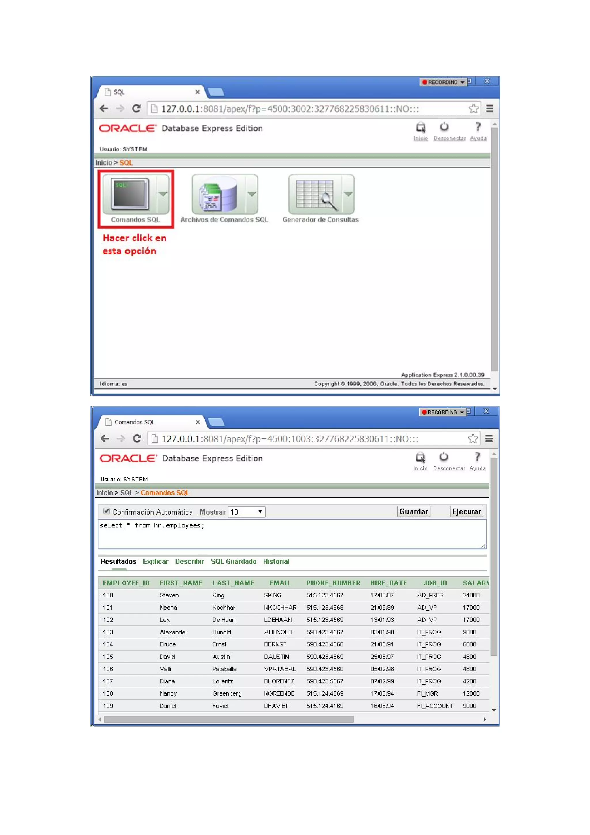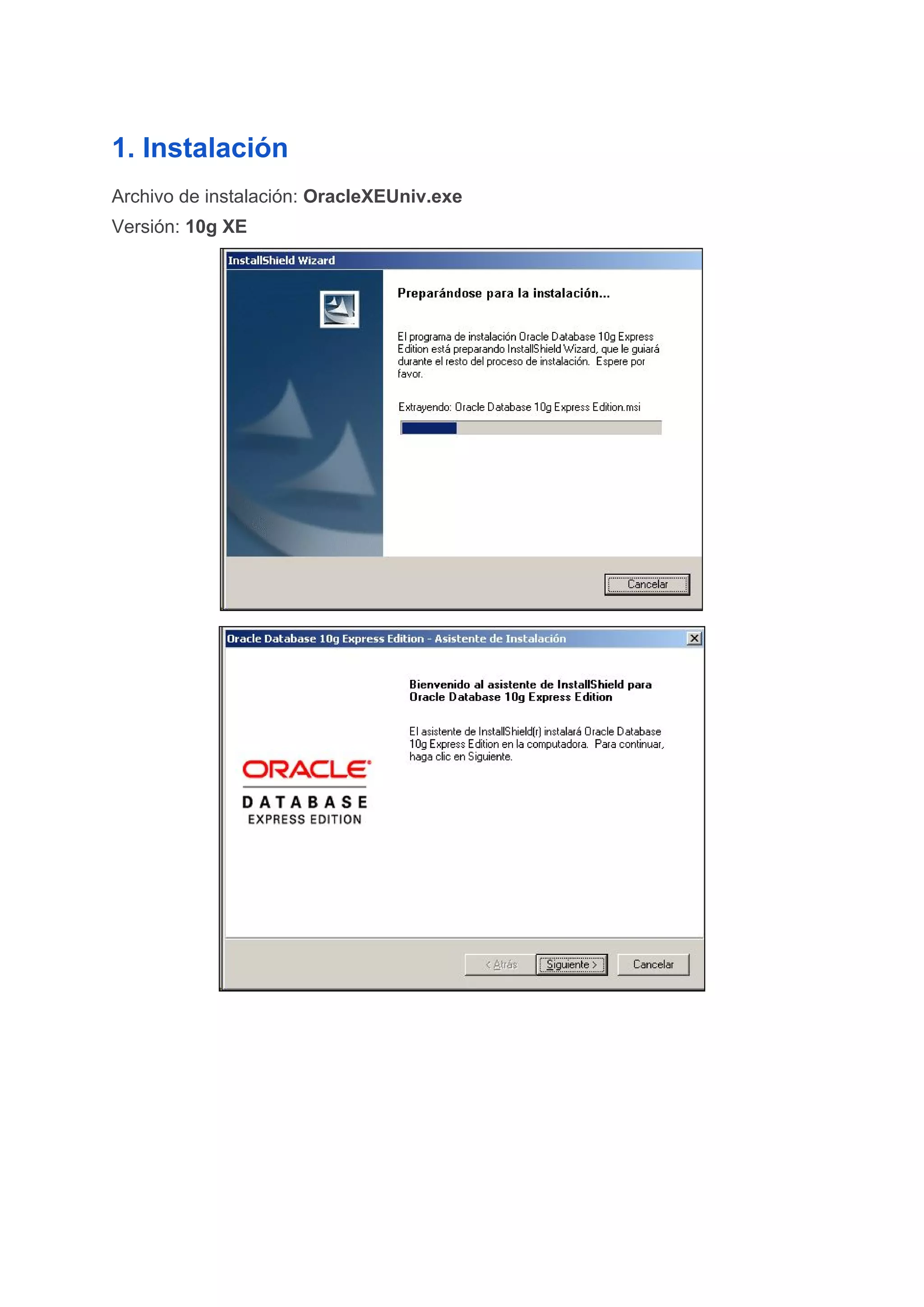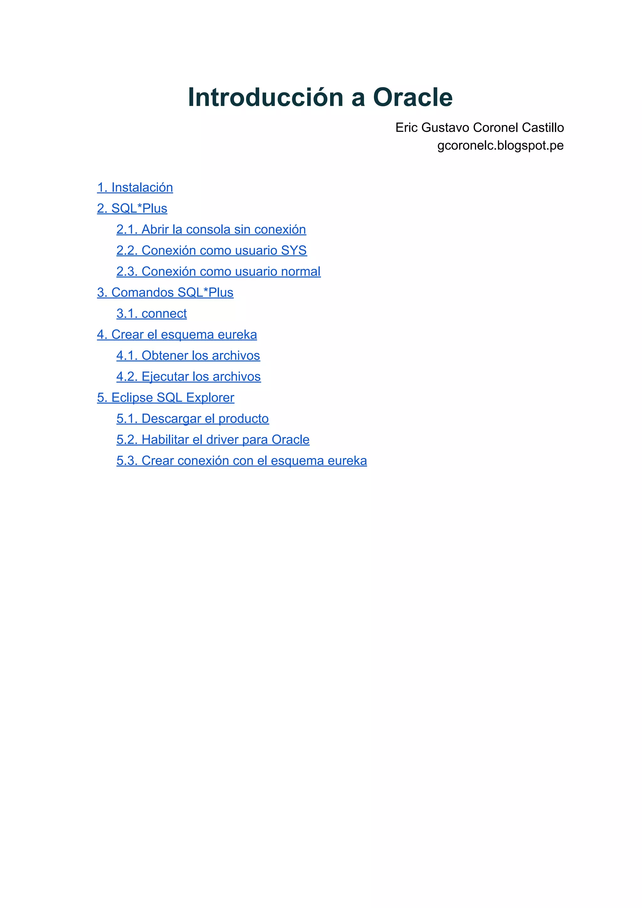 Este documento presenta una introducción a Oracle, incluyendo cómo instalar Oracle XE, usar SQL*Plus para conectarse como usuario SYS o normal, crear un esquema llamado "eureka" ejecutando archivos SQL, y configurar Eclipse SQL Explorer para conectarse a este esquema.