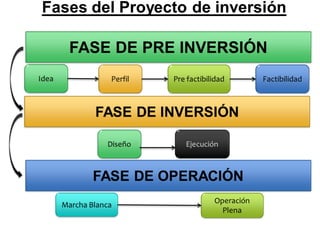 Este documento presenta una introducción general sobre proyectos de inversión. Explica que los proyectos surgen para resolver problemas u oportunidades y pueden ser iniciados por la alta gerencia, clientes u otros. También describe el ciclo de vida de un proyecto, incluyendo las etapas de identificación, formulación, evaluación, ejecución y seguimiento. Finalmente, destaca la importancia de definir objetivos, alternativas y viabilidad durante las etapas iniciales de preinversión de un proyecto.