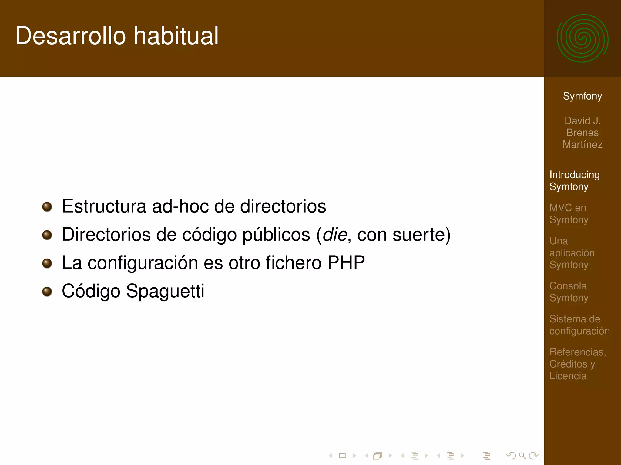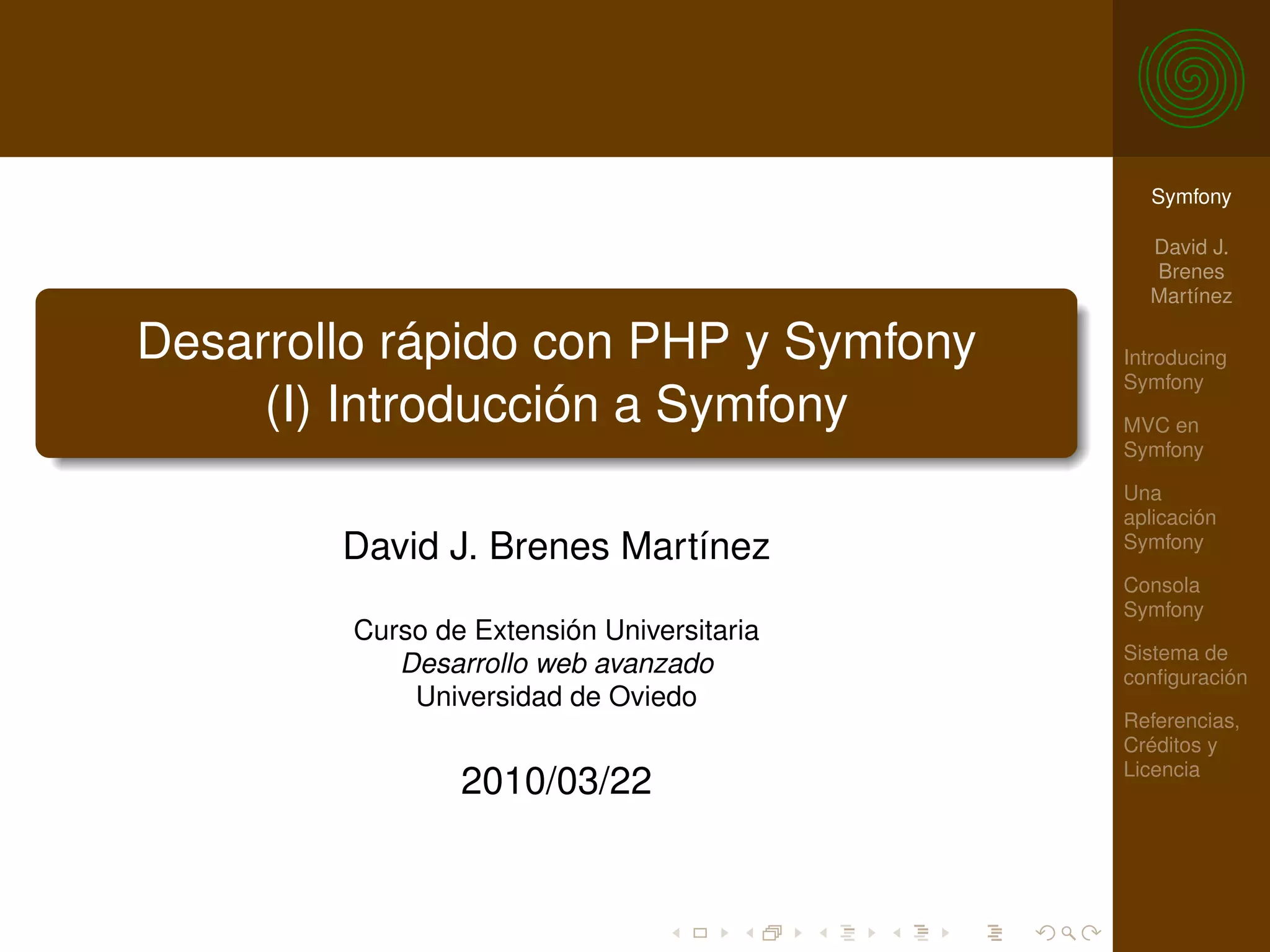 El documento presenta una introducción a Symfony, un framework para el desarrollo ágil de aplicaciones web con PHP, describiendo su arquitectura basada en el patrón MVC y sus características, como la gestión de configuraciones y la modularidad. Además, se discuten las ventajas de utilizar Symfony sobre el desarrollo ad-hoc, enfatizando la importancia de seguir buenas prácticas en el desarrollo de software. También se mencionan los tipos de configuraciones y archivos necesarios para implementar un proyecto Symfony, así como sus entornos y aspectos de seguridad.