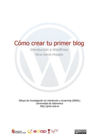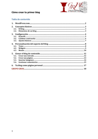 Este documento explica cómo crear un blog usando WordPress. Detalla los pasos para registrarse en WordPress.com, configurar la cuenta de usuario, personalizar la apariencia y contenido del blog, y usar el blog como una página personal. Explica conceptos básicos como elementos de un blog como entradas, etiquetas, categorías y comentarios.