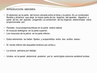 El documento describe la anatomía del abdomen. Resume que el abdomen contiene la mayoría de los órganos digestivos y algunos órganos urogenitales, y está rodeado por músculos en las paredes laterales, el diafragma superiormente y músculos pélvicos inferiormente. Los músculos abdominales pueden contraerse para aumentar la presión interna y facilitar la expulsión de fluidos y otros contenidos del abdomen y tórax. Además, se enumeran los principales músculos de las paredes abdominales y puntos anató