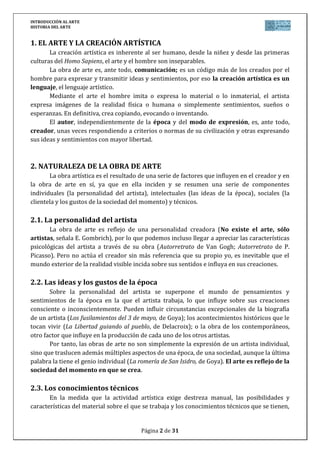 Este documento introduce el concepto de arte y su historia. Explica que el arte es una forma de comunicación humana y que una obra de arte está influenciada por la personalidad del artista, las ideas de la época y los conocimientos técnicos. También clasifica las diferentes artes y discute las teorías sobre la función del arte a lo largo de la historia, desde la imitación de la realidad hasta convertirse en un arte de creación conceptual y subjetiva.