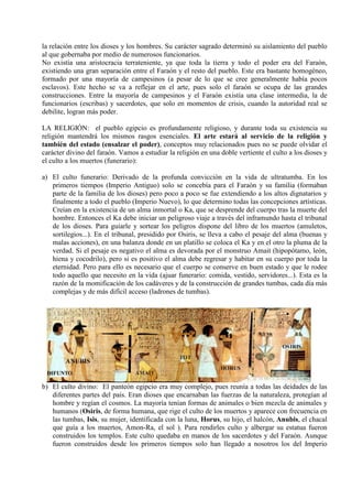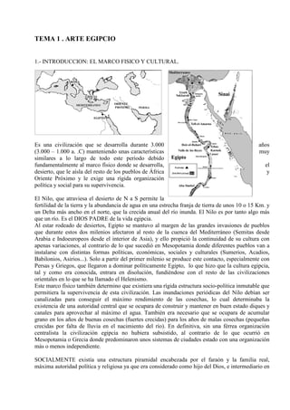 El documento resume la civilización egipcia y su arte. Se desarrolló durante 3,000 años a lo largo del Nilo debido a su aislamiento geográfico. Tuvo una estructura social y política rígida encabezada por el faraón para aprovechar las inundaciones del río. El arte servía para representar las creencias religiosas en la vida después de la muerte y ensalzar el poder del faraón. Se caracterizó por ser monumental, no naturalista y mantener formas inmutables que reflejaban la cosmovisión egipcia.