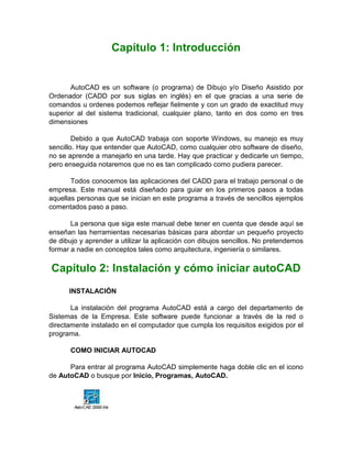 Este documento presenta una introducción al software de diseño asistido por computadora AutoCAD. Explica cómo instalar el programa, crear nuevos dibujos, introducir órdenes, establecer unidades de medida y límites, configurar la rejilla y las coordenadas, y utiliza los comandos básicos como Línea para crear los primeros objetos. El objetivo es guiar a los nuevos usuarios en los primeros pasos de AutoCAD a través de ejemplos sencillos.