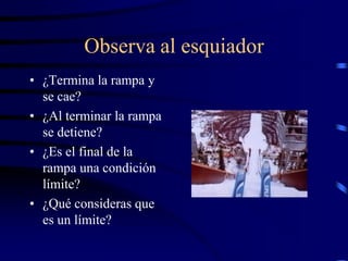 Este documento presenta varios ejemplos de conceptos fundamentales del cálculo como límites, derivadas e integrales y sus aplicaciones en situaciones de la vida cotidiana como el movimiento de esquiadores, nubes, camaleones, máquinas, felinos y palomas. El propósito del curso es que los estudiantes comprendan estos conceptos y sus relaciones para aplicarlos a problemas de ingeniería.