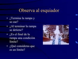 Este documento introduce conceptos básicos de cálculo como límites, derivadas e integrales a través de ejemplos observables en la naturaleza. Se plantean preguntas sobre fenómenos como el movimiento de esquiadores, nubes, camaleones, palomas y máquinas para ilustrar conceptos como límites, variación con respecto al tiempo y otras variables, y acumulación de pequeñas variaciones a través de la integración. El documento concluye que estos conceptos están presentes en muchos procesos naturales y que su estudio y