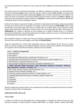 Este documento presenta los diferentes niveles de organización biológica, desde el nivel subatómico hasta el nivel de ecosistema. Se enfoca en los niveles más bajos de organización como el nivel atómico, molecular, macromolecular y celular. Describe las características principales de las células, incluyendo que todas poseen una membrana, metabolismo y material genético en forma de ADN. Finalmente, distingue entre células procariotas y eucariotas.