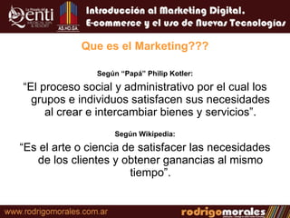 Este documento resume conceptos clave del marketing como satisfacer las necesidades de los clientes y obtener ganancias, y explica cómo Internet y las redes sociales han revolucionado el marketing permitiendo la comunicación viral y relacional a gran escala. También define el marketing digital como aquel que usa plataformas en línea como redes sociales y sitios web interactivos para interactuar con los clientes y mejorar los negocios.