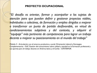 El documento describe la metodología de Proyecto Ocupacional (PO) para mejorar la orientación laboral y empleabilidad. El PO implica que las personas definan y gestionen proyectos formativos y laborales mediante la autoevaluación, fijación de metas, planificación de actividades, y revisión periódica con el objetivo de lograr un trabajo decente. La orientación laboral con enfoque de PO puede darse antes, durante y después de los procesos formativos.