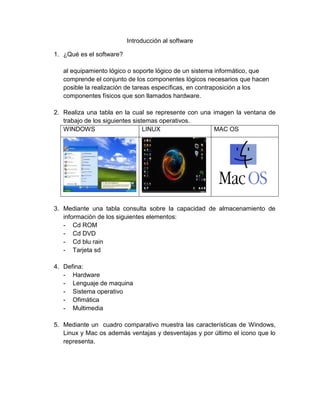 El documento presenta información sobre software y sistemas operativos. Explica qué es el software y proporciona tablas comparando la capacidad de almacenamiento de diferentes dispositivos. También define términos como hardware, lenguaje de máquina, sistema operativo y ofimática. Finalmente, incluye un cuadro comparativo de las características, ventajas y desventajas de Windows, Linux y Mac OS.