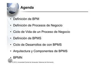 Este documento presenta una introducción a los sistemas de gestión de procesos de negocio (BPMS). Explica definiciones clave como BPM, procesos de negocio, ciclo de vida de procesos y BPMS. También describe componentes de un BPMS, el lenguaje BPMN y cómo un BPMS puede mejorar el ciclo de desarrollo de software en comparación con un enfoque tradicional.