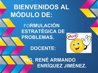 Este documento presenta un módulo sobre formulación estratégica de problemas. El objetivo es que los estudiantes desarrollen habilidades para analizar enunciados, identificar variables y relaciones, y responder interrogantes con base a datos. El módulo cubre temas como tipos de problemas, definición de problemas, y pasos para resolver problemas.