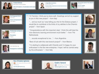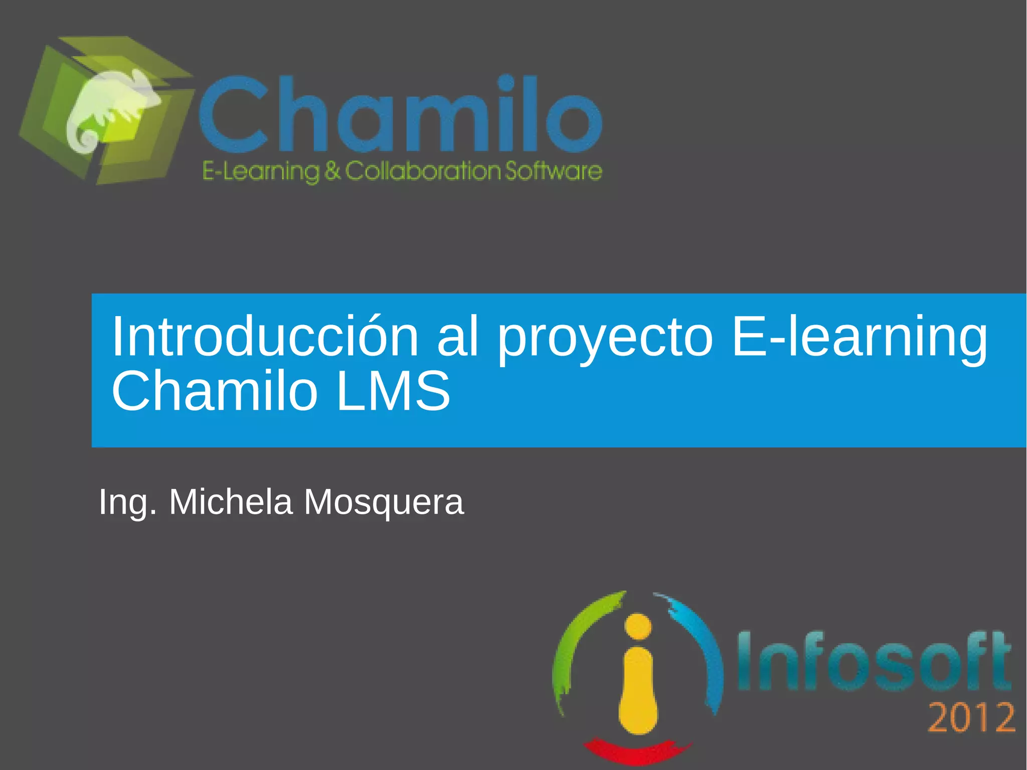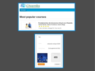 Este documento presenta Chamilo, un sistema de gestión de aprendizaje (LMS) de código abierto. Explica que Chamilo ofrece herramientas para la comunicación y evaluación en línea y permite la administración de cursos, reportes y roles de usuario. También proporciona información sobre su licencia, orígenes, uso a nivel mundial, documentación y cómo las personas pueden probar, usar y contribuir a Chamilo.