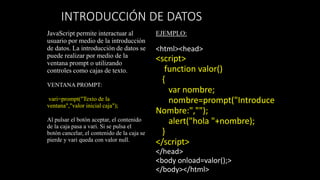 Este documento presenta diferentes métodos para introducir y manipular datos en JavaScript, incluyendo ventanas prompt, cajas de texto, matrices, y funciones. También describe sentencias de control como if/else, switch, while, do/while y for para controlar el flujo del programa, así como propiedades y métodos de funciones. Finalmente, ofrece ejemplos prácticos de código JavaScript que ilustran estos conceptos.