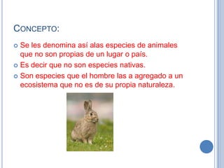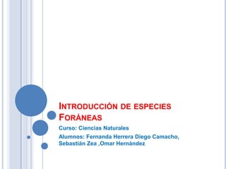 Este documento presenta ejemplos de especies foráneas introducidas en diferentes ecosistemas. Se describen las introducciones de camellos dromedarios en Australia, la planta invasora Kudzu en Estados Unidos, castores en la Patagonia argentina que se multiplicaron sin control, la expansión global de la hormiga argentina, y la invasión del mar Mediterráneo por más de 300 especies marinas del océano Índico luego de la apertura del canal de Suez.