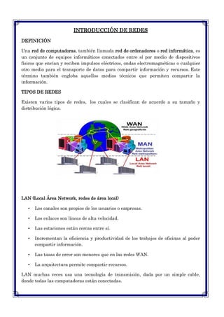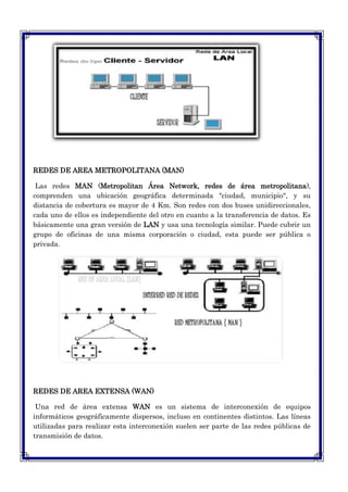 Este documento describe los diferentes tipos de redes de computadoras, incluyendo redes de área local (LAN), redes de área metropolitana (MAN), redes de área extensa (WAN), así como las principales topologías (bus, estrella, anillo). También define los conceptos de servidor, medios de conexión a Internet como cable, satélite e inalámbricas.