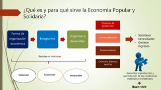 La Economía Popular y Solidaria es una forma de organización económica basada en principios de solidaridad, cooperación y reciprocidad. En Ecuador existen más de 8,000 organizaciones de Economía Popular y Solidaria, incluyendo cooperativas, asociaciones y unidades económicas populares, que generan empleos y contribuyen significativamente a la economía nacional. La Economía Popular y Solidaria busca satisfacer necesidades y generar ingresos de una manera que garantice la producción y reproducción de las condiciones materiales e inmateriales para el buen vivir.