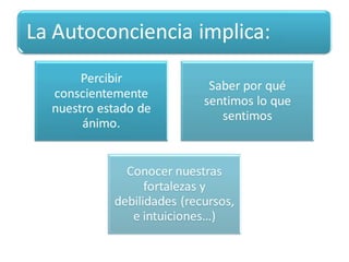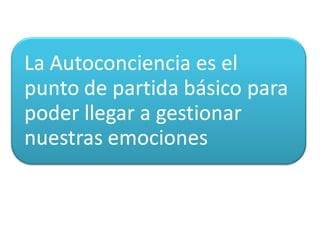 El documento habla sobre el entrenamiento emocional. Explica que las emociones sirven para guiarnos y no para atormentarnos, y que debemos conocernos a nosotros mismos para desarrollar conciencia perfecta. También recomienda prestar atención a las sensaciones físicas en el cuerpo para identificar mejor las emociones, aprender a diferenciar entre diversas emociones, y medir su intensidad para no perder el control.