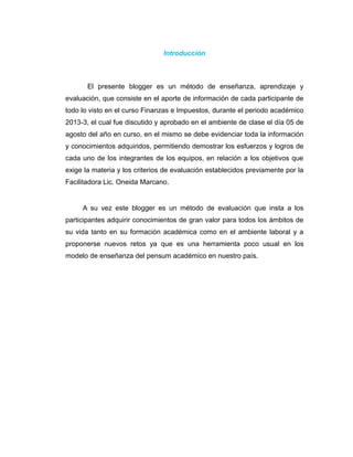 Este documento introduce un blogger como un método de enseñanza, aprendizaje y evaluación para un curso de Finanzas e Impuestos donde los estudiantes comparten información sobre lo que han aprendido. El blogger permite a los estudiantes demostrar sus logros individuales y de equipo relacionados con los objetivos de la materia. Además, el blogger es un método de evaluación que motiva a los participantes a adquirir conocimientos valiosos para su formación académica y laboral mediante el uso de una herramienta poco común en los modelos