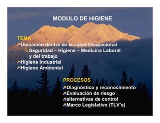 El documento trata sobre higiene industrial y ambiental. Explica que la higiene se ubica dentro de la salud ocupacional y abarca procesos como diagnóstico, evaluación de riesgos y alternativas de control. También describe los componentes de una empresa y la administración y gestión de riesgos para lograr objetivos empresariales de manera rentable y sostenible en el tiempo.