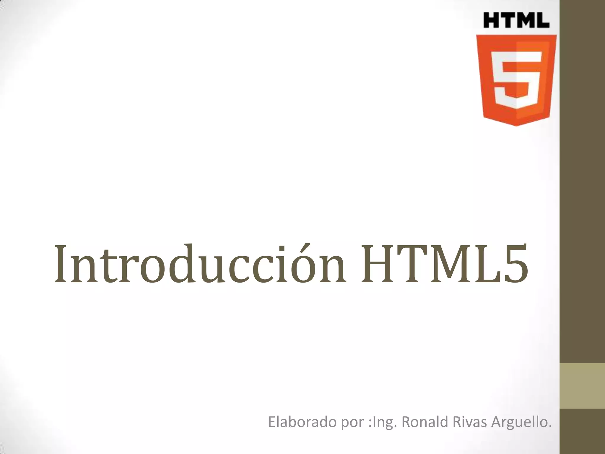 HTML5 es un lenguaje de modelado web que introduce nuevas etiquetas como <header>, <nav>, <section>, <article>, <aside> y <footer> para estructurar páginas web. Estas etiquetas permiten crear encabezados, menús de navegación, secciones de contenido, artículos dentro de las secciones, contenido adicional y pie de página. Para que los navegadores reconozcan el lenguaje HTML5, la declaración debe ser <!Doctype HTML>.