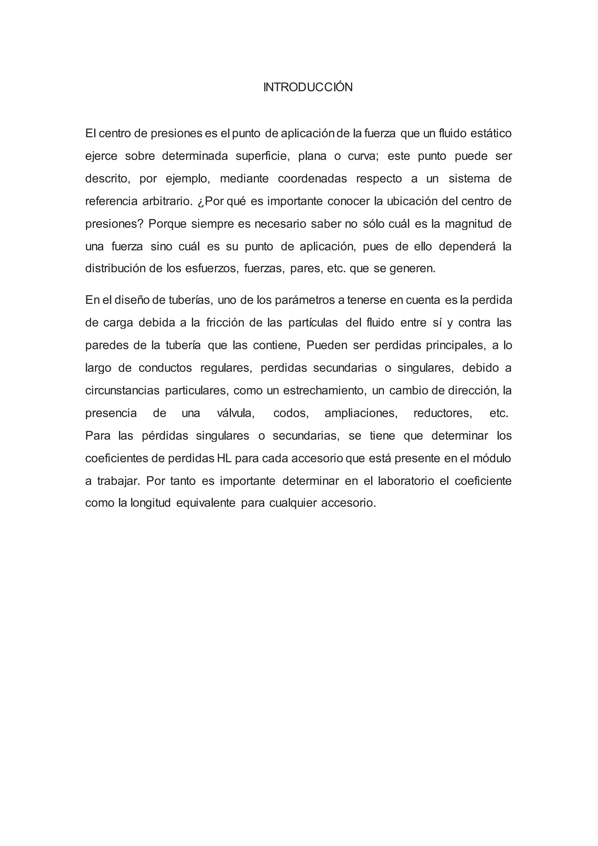 Este documento describe un experimento para determinar la ubicación del centro de presiones de una fuerza hidrostática que actúa sobre una superficie curva. El experimento involucra medir la desviación de un cuadrante cilíndrico pivotado producida por varios niveles de agua, y usar esto para calcular la posición del centro de presiones. Los resultados experimentales se comparan con las expresiones teóricas para validar el método.