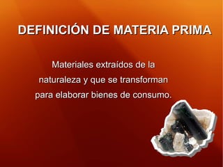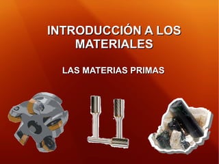 El documento introduce los conceptos de materiales y materias primas, definidas como aquellas extraídas de la naturaleza y transformadas para elaborar bienes de consumo. Proporciona ejemplos de materias primas de origen vegetal, animal y mineral e introduce otros orígenes como el petróleo, gas natural e hidrógeno. Explica que los materiales se pueden clasificar de diferentes formas, incluyendo por su composición, origen y propiedades físico-químicas, tecnológicas, ecológicas y mecánicas.