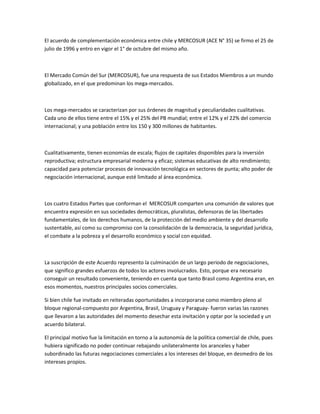 Este documento resume la historia y características del Mercado Común del Sur (MERCOSUR). Explica que el MERCOSUR se formó en 1991 como una alianza comercial entre Argentina, Brasil, Paraguay y Uruguay para promover el libre comercio y la integración económica. Aunque tenía la ambición de convertirse en un mercado común pleno, ha tenido dificultades para implementar completamente sus objetivos debido a retrasos y a la falta de instituciones supranacionales fuertes. El documento también analiza cómo Chile se unió como