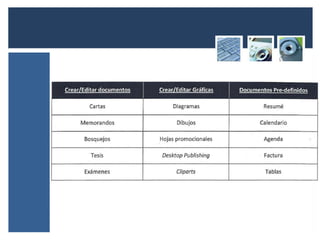 MS Word es un poderoso procesador de palabras que permite preparar documentos de manera eficiente. Sus principales componentes incluyen la cinta de opciones (Ribbon) con secciones como Home, Insert y Page Layout que permiten dar formato a texto, insertar tablas e ilustraciones, y modificar atributos de páginas. El documento también describe los diferentes elementos que se pueden insertar y modificar en un documento de Word.