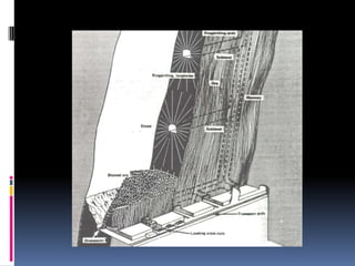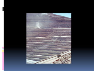 El documento describe dos métodos principales de minería: minería a cielo abierto y minería subterránea. La minería a cielo abierto implica excavar los materiales que recubren el yacimiento y extraer el mineral mediante dinamita y maquinaria pesada. La minería subterránea incluye métodos como cámaras y pilares, hundimiento por subniveles y corte y relleno, los cuales se utilizan dependiendo de si el cuerpo mineralizado es tabular o irregular y del tipo de roca.