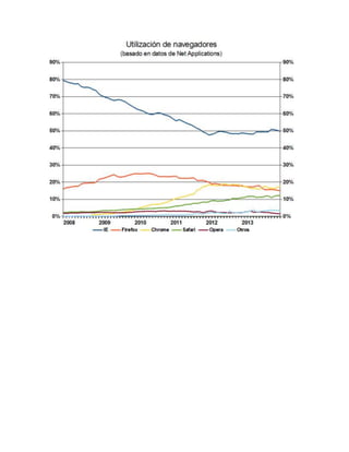 El documento describe la historia y evolución de los principales navegadores web desde su creación en la década de 1990 hasta la actualidad. Comenzó con Mosaic en 1993, seguido de Netscape en 1994 que se convirtió en el líder del mercado hasta 1996 cuando Microsoft lanzó Internet Explorer. Aunque Internet Explorer dominó durante muchos años, Firefox surgido en 2004 logró una cuota de mercado significativa hasta la llegada de Google Chrome en 2008. Otros navegadores notables son Opera y los derivados del código abierto de Mozilla como SeaMonkey.