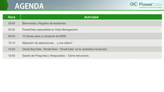 Este documento presenta una conferencia sobre las oportunidades de negocio que genera el conocimiento de los datos de una empresa. La agenda incluye presentaciones sobre gestión de datos maestros, migración de aplicaciones y datos, y el valor de los "small data". PowerData, especialista en gestión de datos, ofrece sus servicios en países de Latinoamérica y España utilizando tecnología, personas y procesos para armonizar los datos de las empresas y extraer su valor a través de iniciativas de TI e implementación de proyectos.